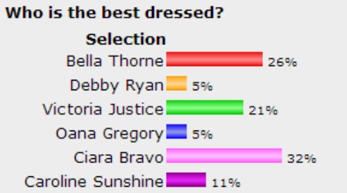 Ciara Bravo (Nick's "Big Time Rush") was chosen best dressed, followed by Bella Thorne (Disney's "Shake It Up") and Victoria Justice (Nick's "Victorious"). Ciara dress was absolutely stunning at the KCA's. If you haven't seen it, you can watch the video below from the KCA's: